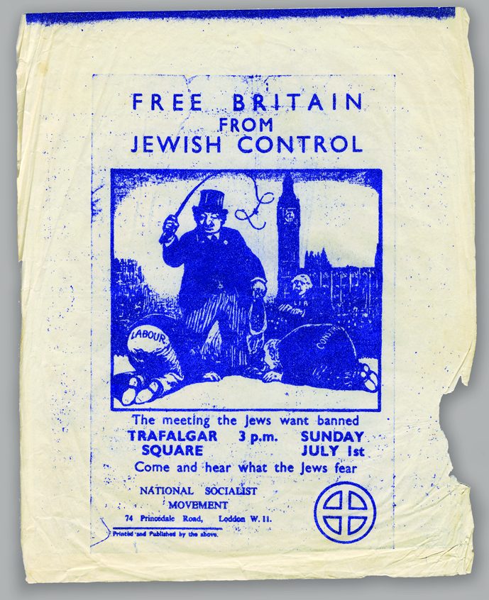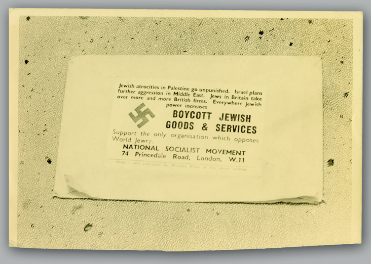 The complex connection between modern anti-Israel hatred, historical antisemitism and contemporary bias against British Jews and Jewish bodies is a theme that permeates the report; especially in the section on boycotts. This includes a [British] National Socialist Movement sticker c.1962 which states, ‘Jewish atrocities in Palestine go unpunished…Everywhere Jewish power increases. Boycott Jewish Goods & Services’.