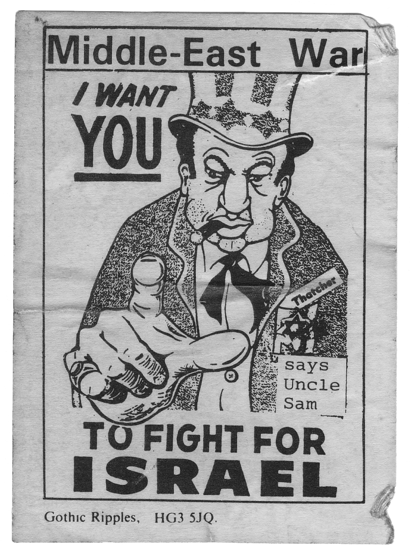 These charges were starkly shown in 1991 during the first Iraq War by a sticker from the veteran UK far right outfit, Gothic Ripples. This is shown below, and combines anti-Americanism with antisemitism and anti-Israel hatred. By the second Iraq War, however, such attitudes were increasingly widespread; and the charge is now quite routine in the gathering controversy over possible American responses to Iran’s growing nuclear capabilities.