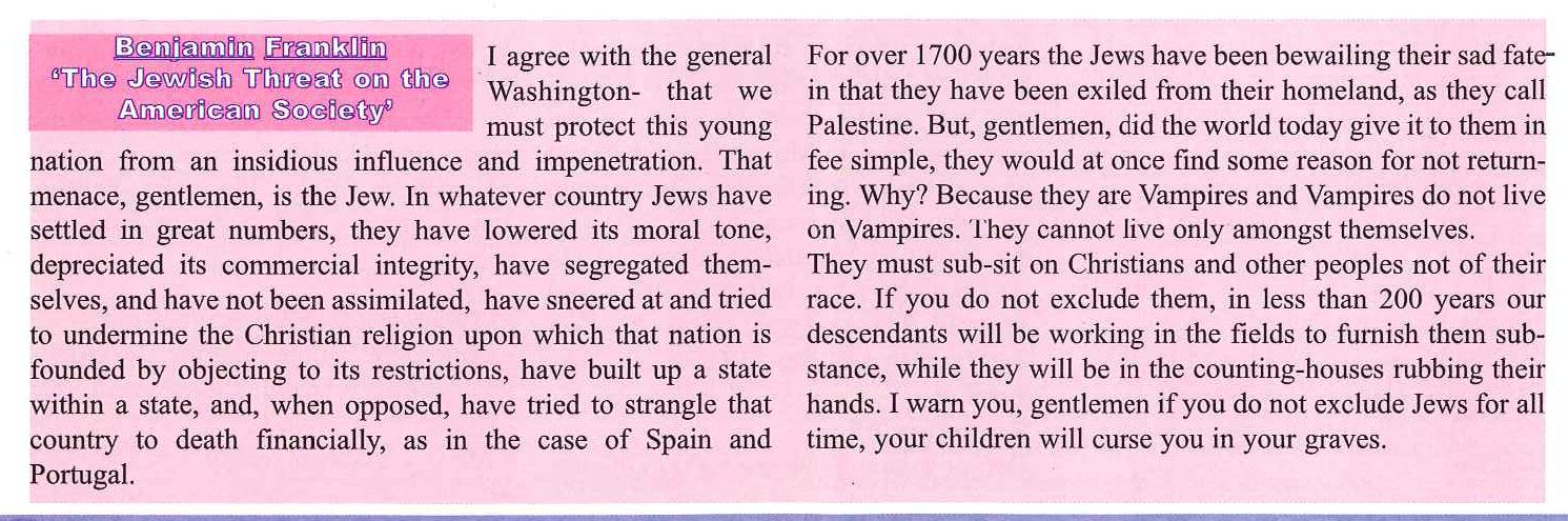 11)The article claimed to be written by Benjamin Franklin, in which Jews were described as vampires and seen as a scourge on America, was not published by MAB, as Browne alleges.