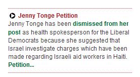 We, the undersigned, object to the dismissal of Baroness Jenny Tonge from her post as health spokesperson for the Liberal Democrats simply because she suggested that Israel investigate charges made against it.