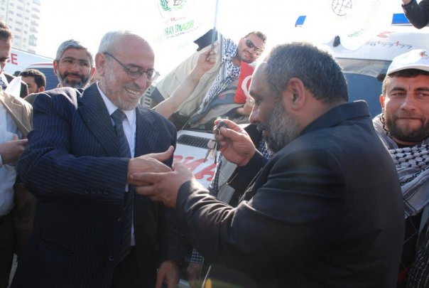 Israel sure got that one right. Here is IHH’s president, Bülent Yildirim, being received by Hamas leader Ismail Haniyeh during the last Viva Palestina convoy to Gaza. IHH was a major contributor to the convoy.