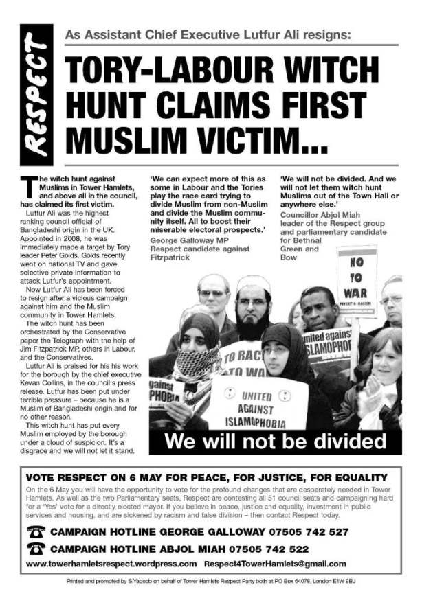 Here is another leap. Lutfur Ali, the moonlighting assistant chief executive of Tower Hamlets council, resigned from his post three weeks ago. Stung, Socialist Unity published this disgraceful Respect leaflet. Why did Ali really step down? Not the moonlighting. Oh no: