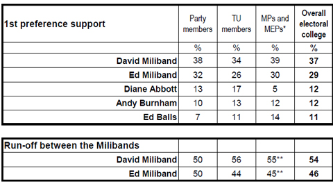 A YouGov poll of Labour Party members, affiliated trade union members and MPs confirms David Miliband not only as the frontrunner, but puts him on course to win the first and crucially the second ballot in a run off with his brother Ed Miliband.