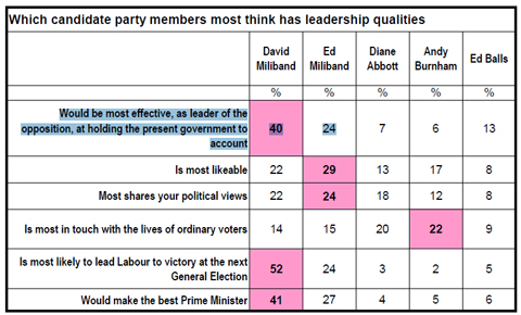 However, maybe the most crucial piece of information that this poll delivers is what supporters of David Miliband have known since the start. Asked who is most likely to lead Labour to victory at the next General Election those surveyed put David Miliband far ahead on 52 compared to Ed Miliband on 24.