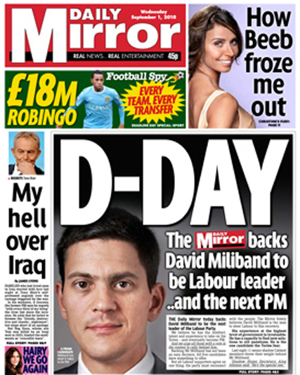 On the day that the front pages are full of Tony Blair having his say about Gordon Brown, telling The Guardian he knew Brown would be a “disaster”, The Daily Mirror has chosen the day that ballot papers are sent out to Labour Party members to splash with a front page endorsing David Miliband.
