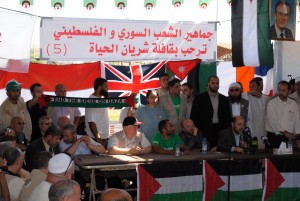Here is a photograph (click to enlarge) from a press conference held earlier today in Latakia, Syria, by Viva Palestina, George Galloway’s mission for the political and material support of Hamas.