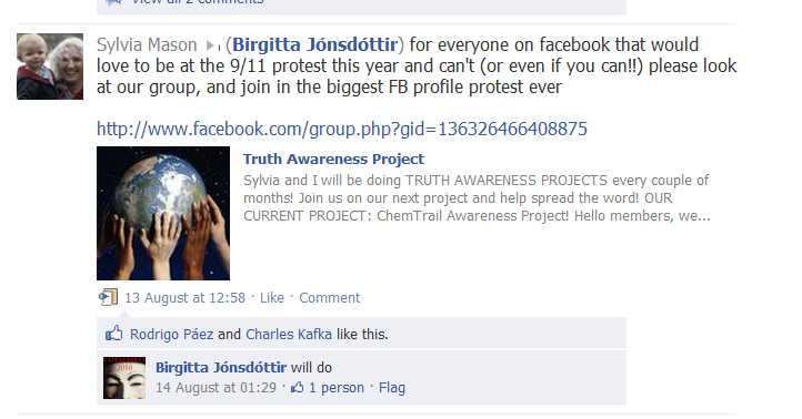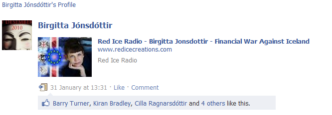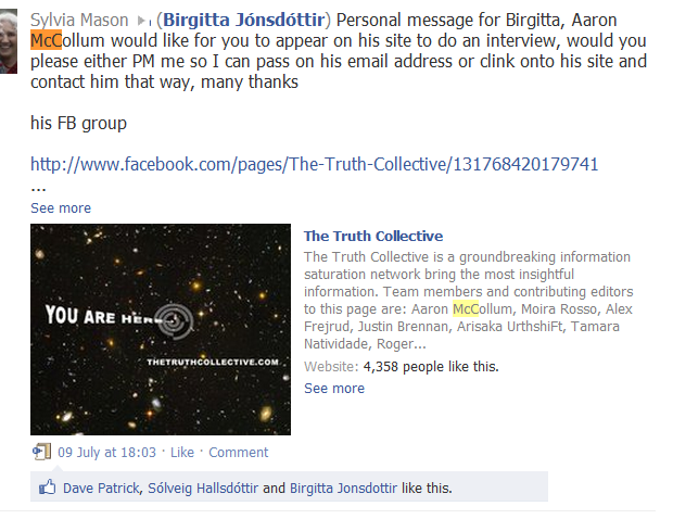 Here, Jonsdottir ‘likes’ a request to appear on the website conspiracy nut Aaron McCollum: