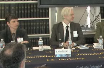 Here she is with Assange in happier days, on a panel at UC Berkeley School of Journalism: