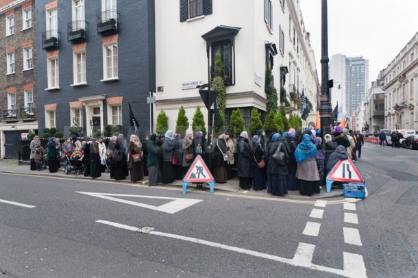 So Hizb ut-Tahrir were forced instead to hold their own separate demonstration around a hundred yards away around the corner along South Audley St, where they were spread out along the pavement between South Street and Hill Street. As always at their events, everyone was dressed in black and the men and women were segregated. The men filled most of the pavement along South Audley St, with just a few women at one end, with most of them around the corner eastwards on South Street, away from the loudspeakers and the embassy. It seemed a clear demonstration of the lack of equality they would like to impose.