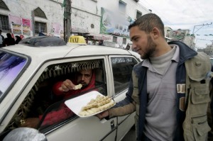 “A Palestinian man distributes sweets in the streets of the southern Gaza Strip town of Rafah on March 12, 2011 to celebrate an attack which killed five Israeli settlers at the Itamar settlement near the West Bank city of Nablus.”