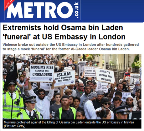 Yes, hundreds of Muslim fundamentalists have marched this weekend on the US Embassy in London to protest the killing of Osama Bin Laden. They have also released a video inciting the murder of Prince Harry to “avenge the death” of Bin Laden.