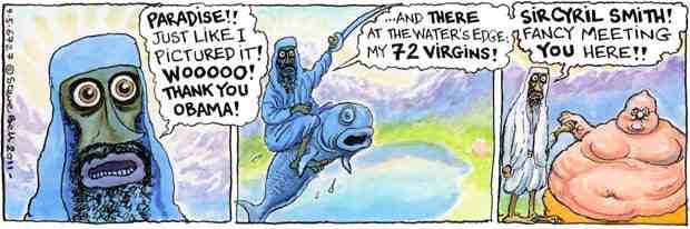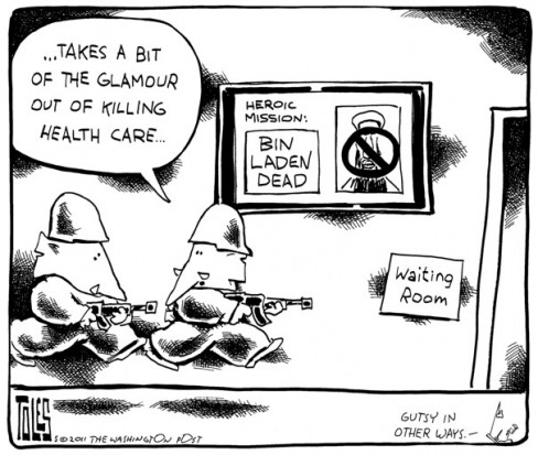 Gene adds: Washington Post cartoonist Tom Toles, somewhat more cleverly, used the killing of bin Laden to take a shot at the Republican position on health care. Sure to make all the right people sputter.