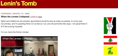 Update: Notice the flag at the lower right featured in 2006 on Lenin’s Tomb, the blog of budding Marxist intellectual and Socialist Workers Party cadre Richard Seymour.