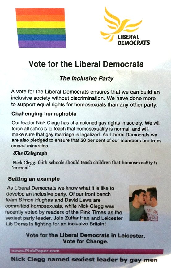 Leicester South was, of course, where fake ‘Lib Dem’ leaflets describing various Lib Dem MPs as ‘committed homosexuals’ and explaining in some detail their supposed extensive supposed pro-homosexual agenda were distributed, in predominantly Muslim areas.