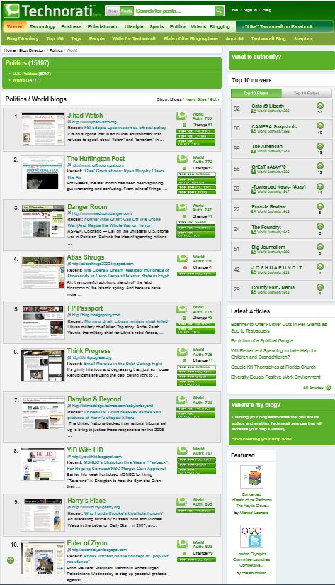 I’m not sure what it means– and disturbingly Robert Spencer’s and Pamela Geller’s toxic blogs are ranked numbers 1 and 4– but Technorati is rating Harry’s Place as the number 9 authority on world politics among 14,777 blogs.
