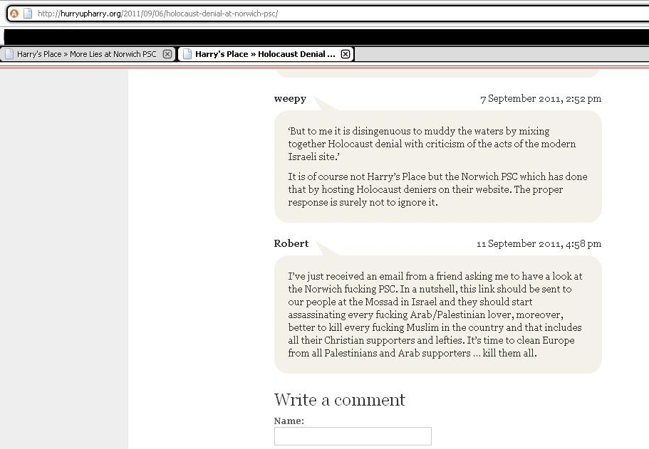 1. Khaled Sa’aran, the webmaster of Norwich PSC has posted racist abuse on Harry’s Place under a number of different names