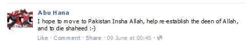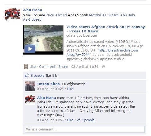 Bin Laden too gets a nod. In June Dar posted this video to Facebook. It is a jihadi song about the glory of death as a “martyr”. It was uploaded by a Youtube user when news of Bin Laden’s death had broken. The user titled it “Winds of Paradise Dedicated to Sheikh Usama”. Dar called it a “beautiful nasheed” (religious song).