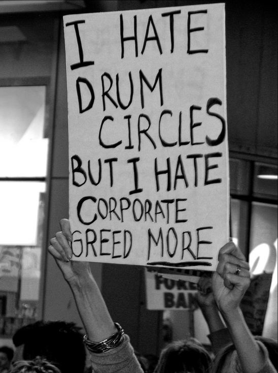 c) Admit that they hate drum circles much, much more than they hate corporate greed.