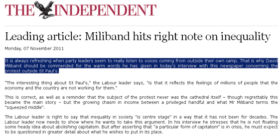And not just in some alternative history, but in the mind of the Independent leader writers and its sub editors who published this leader article this morning in reference to Ed Miliband’s piece in the Observer yesterday on the Occupy St Paul’s protestors.