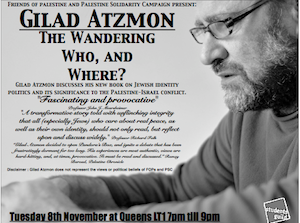Tuesday 8th November at Queens LT1 7pm till 9pm, Friends of palestine and Palestine Solidarity Campaign present: Gilad Atzmon The Wandering Who, and Where
