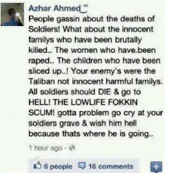 Yorkshire 19-year old Azhar Ahmed is facing charges of “racially aggravated public order offences” after he posted an angry Facebook status update about the reporting of the latest British Army fatalities in Afghanistan.