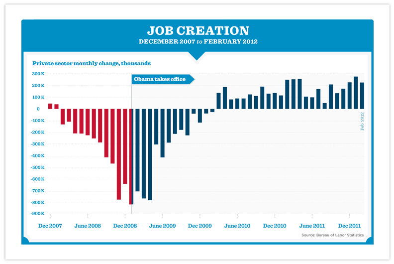 Of course there are far too many families suffering from the after-effects of the 2008 economic collapse (there were too many families suffering before that). But this graph showing monthly net private-sector job loss/creation at the end of the Bush administration through the first three years of the Obama administration helps put things in perspective (and helps explain why Bush has gone virtually unmentioned by the candidates for the Republican nomination):