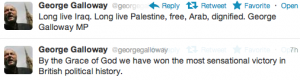 Galloway himself announced his win, on Twitter, in terms which played directly to the religious identity of his core supporters.