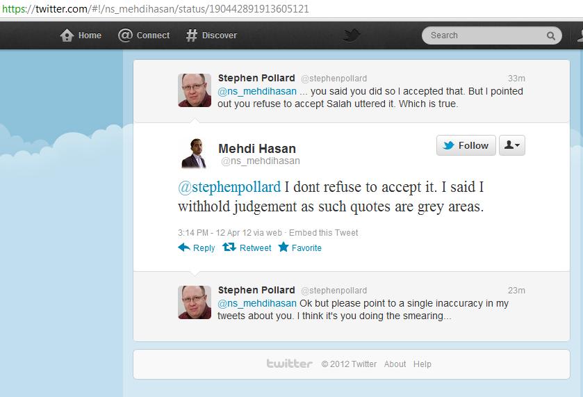 First, it was necessary to establish what Mehdi Hasan thought of the blood lie. After ignoring my tweets, Mehdi Hasan condemned the blood libel, in a series of tweets to Stephen Pollard: