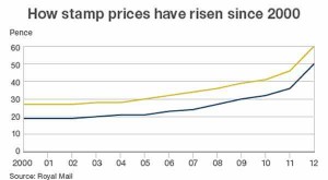 Believe it or not, there still are forms of communication done by post instead of e-mail. Left Foot Forward carries a graphic showing the increase in price for first and second class stamps since 2000, and the impending rises of 14 pence to 60 and 50 pence respectively as of 30 April.