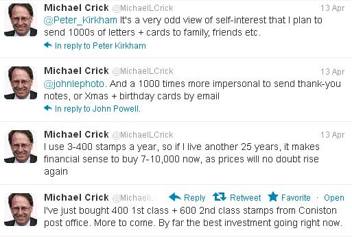 I have less sympathy for Michael Crick, political editor of Channel4 News who declared on Twitter that he had bought one thousand stamps, and would buy upwards of 10,000 if he could for an “investment”. Subsequent tweets stated that he was not seeking to sell them on, thus profiteering as the Royal Mail seems to be.