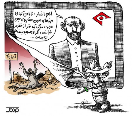 Many people have… shared [on social media] Mana Neyestani’s cartoon commenting on the weak coverage of the disaster by Islamic Republic of Iran Broadcasting. An IRIB anchor announces, “Important news: The West’s new scenario — creating instability along Syria’s borders. The death of one person from poverty in France. Zionists concerned by the meeting of…” The corner of the television screen on which he appears is peeled back, revealing a dead child and wailing mother. A sign amid the surrounding rubble reads “Azerbaijan.”