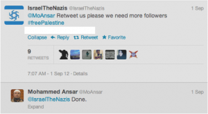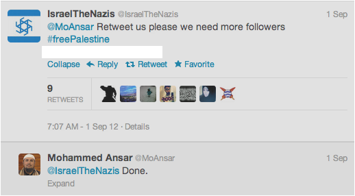 ‘IsraelTheNazis’ approached Mohammed Ansar on Twitter for their endorsement. You would think that someone who calls themselves a ‘Muslim political and social commentator’ would educate the Twitter user on discourse and ask them to stop. Sadly, an endorsement was forth coming.