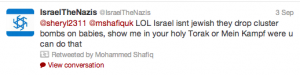 Here is Mohammed Shafiq retweeting and spreading the lie that Israel drops ‘cluster bombs on babies’ before telling a twitter user to check the Torah or ‘Mein Kampf’.