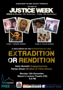On Monday 12th November, the firstevent will feature Asim Qureshi, the executive director of CagePrisoners, who will discuss extradition and rendition in an event that focuses on the cases of Babar Ahmed and TalhaAhsan, extradited to the US last month.