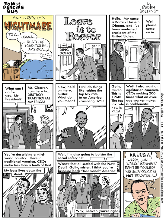 Fans of the classic “Leave it to Beaver” sitcom (which appeared on American TV from the late 1950s to the early 1960s and has since been endlessly rerun) may appreciate this brilliant take on what conservatives like Fox News’s Bill O’Reilly consider a golden age of traditional family values here in the US: