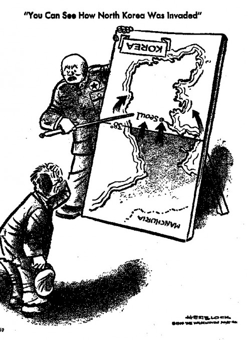 Gene adds: Galloway of course is simply repeating the Communist line at the time of the Korean war, as depicted in this 1950 Herblock cartoon: