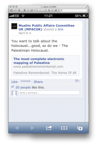 It’s perfectly possible to discuss the history and politics of Israel/Palestine from a Palestinian perspective without being antisemitic. I’m reading Sari Nusseibeh’s Once Upon a Country: A Palestinian Life at the moment, and I don’t find myself reaching for the EUMC Working Definition. Neither, for different reasons, do I feel I need it to help explain the MPAC perspective.