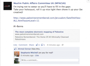 Definitions of antisemitism are a contested issue. However no very refined tool is needed to spot a problem with this comment on MPAC’s Facebook page.