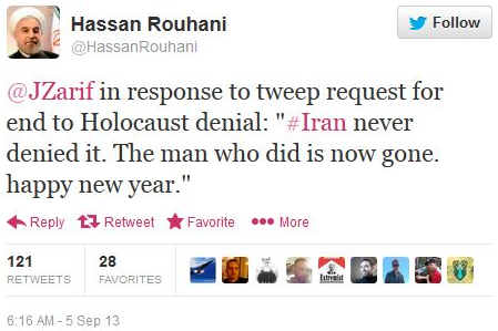 Additional update: And now Iran’s Fars News Agency is denying that the tweets attributed to Rouhani (including the Rosh Hashanah greeting to Jews) are coming from Rouhani. If true, I suppose that makes the Zarif tweets questionable too.