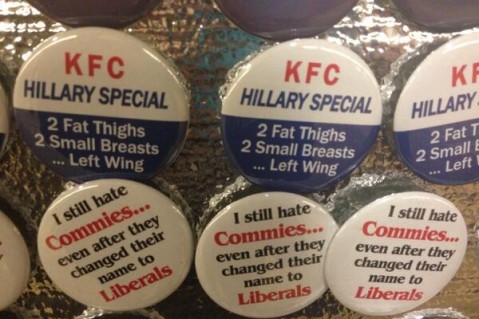 These anti-Hillary Clinton buttons, reportedly a “popular” item, were for sale at the recent convention of the California Republican party.