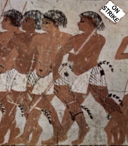 According to Today in Labor History, November 23 may or may not be the anniversary of the first recorded (on papyrus) labor strike, by Egyptians working on public works projects for King Ramses III in the Valley of the Kings: