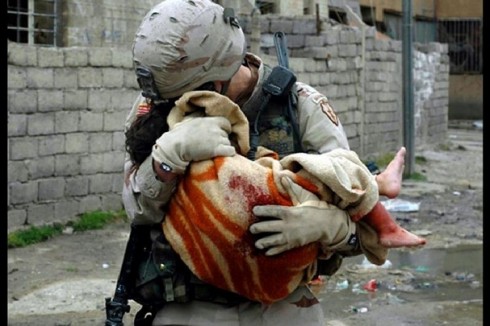 It shows a US soldier comforting a child fatally wounded in a suicide car bomb blast in Mosul, Iraq.