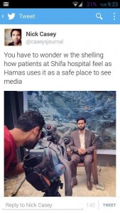 16. Nick Casey of the Wall Street Journal tweeted: “you have to wonder with the shelling, how patients at Shifa hospital feel as Hamas uses it as a safe place to see media.” Never mind wondering; did you ask any patients how they feel?