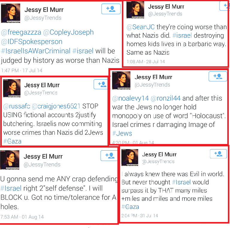 She tweets at @JessyTrends – mostly about Israel and Gaza. Writing in The Daily Star Lebanon last month, she opposed the idea of journalistic objectivity in Gaza. She excitedly tweets and retweets outrageous views of Jews and Israel.