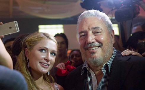 Famous-for-being-famous Paris Hilton takes a selfie with Fidel Castro Jr. in the hotel in Havana that her great-grandfather opened and Castro Jr.’s father nationalized.