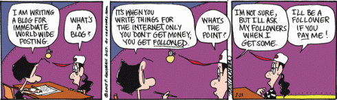 Now that the heroine of my favorite comic strip “Agnes” has decided to venture into the blogosphere, I’ll be following her progress (or lack of same) especially closely this week.