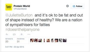 Protein World’s reaction has been rather more belligerent, comparing feminist objectors to terrorists, and compounding possible problems with the original campaign: