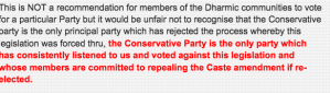So what precisely is the heinous piece of legislation proposed by the Labour LibDem parties that these Hindu/Sikh/Jain groups take such exception to? That’s right, the proposed legislation would prohibit unlawful discrimination on grounds of caste (like discrimnination has been unlawful on grounds of colour, race etc for decades)!