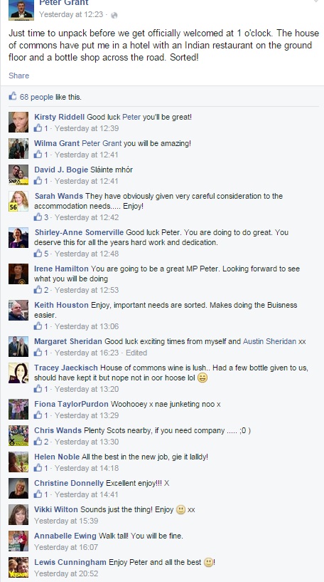 After securing a swing of 35% against Labour in the Glenrothes constituency, Peter Grant (previously Leader of the SNP group at Fife Council) has wasted no time identifying the correct priorities. From his personal Facebook page – currently public but I suspect it, and social media pages of many other new SNP MPs, will soon be closed from view – before even getting his official pass, he has delighted in the Indian restaurant in his hotel (paid for by Wastemonster) and the bottle shop across the road.