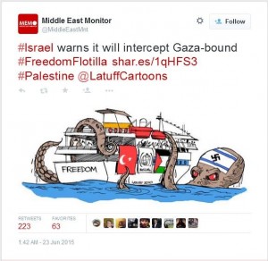 Then there is the question of the other speakers at MEMO’s conference. One Carlos Latuff, a cartoonist who regularly uses antisemitic imagery in his cartoons. Here is MEMO, just last week, using one of Latuff’s cartoons that compares Israel to Nazi Germany and, just for good measure, reproduces the antisemitic trope of a Jewish or Zionist octopus: